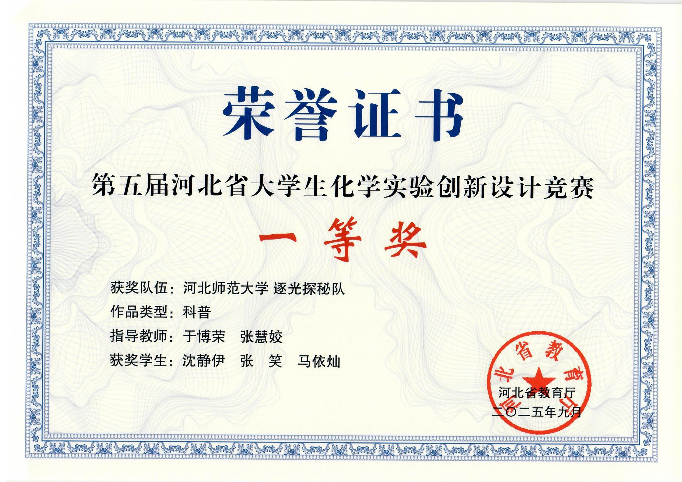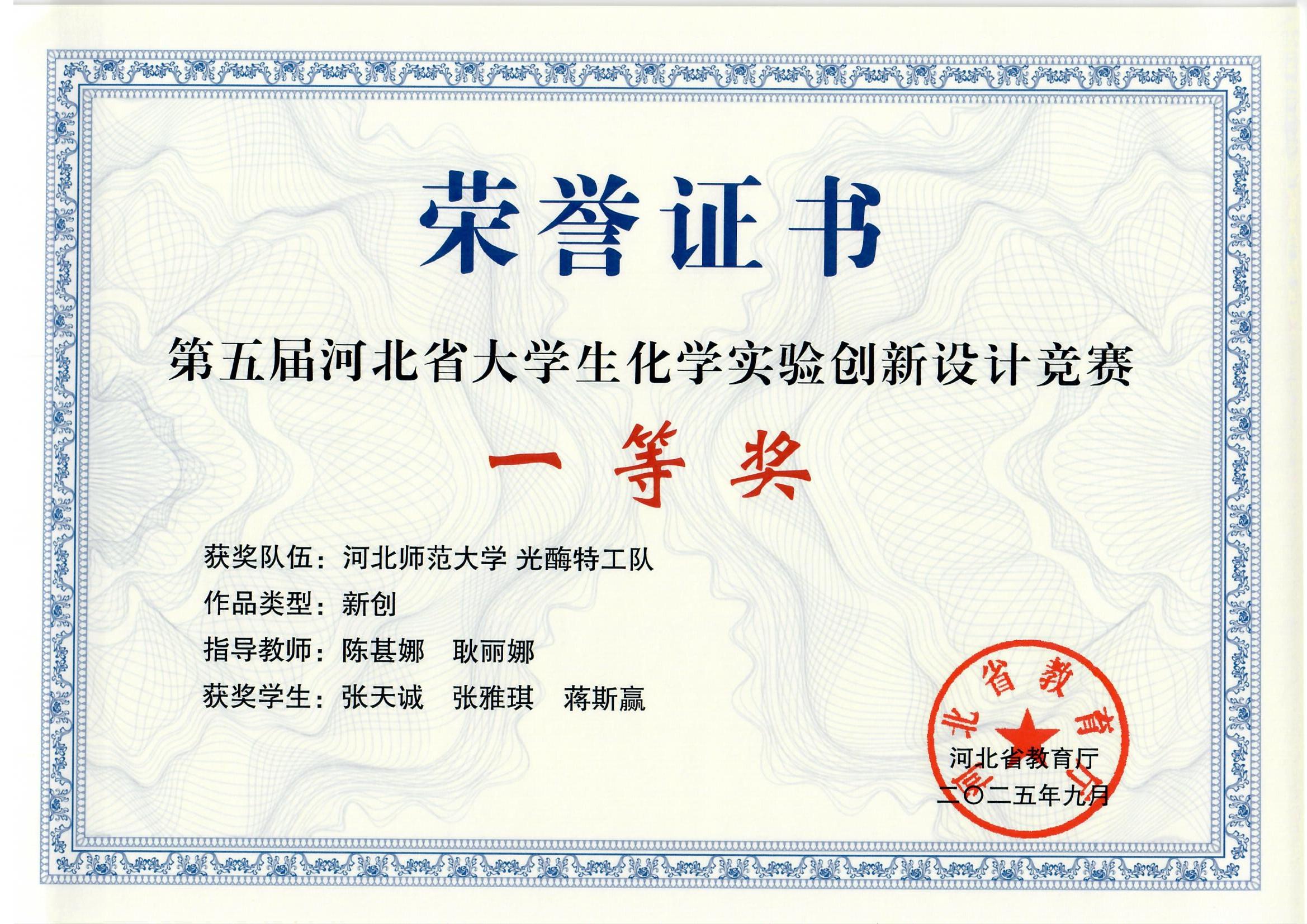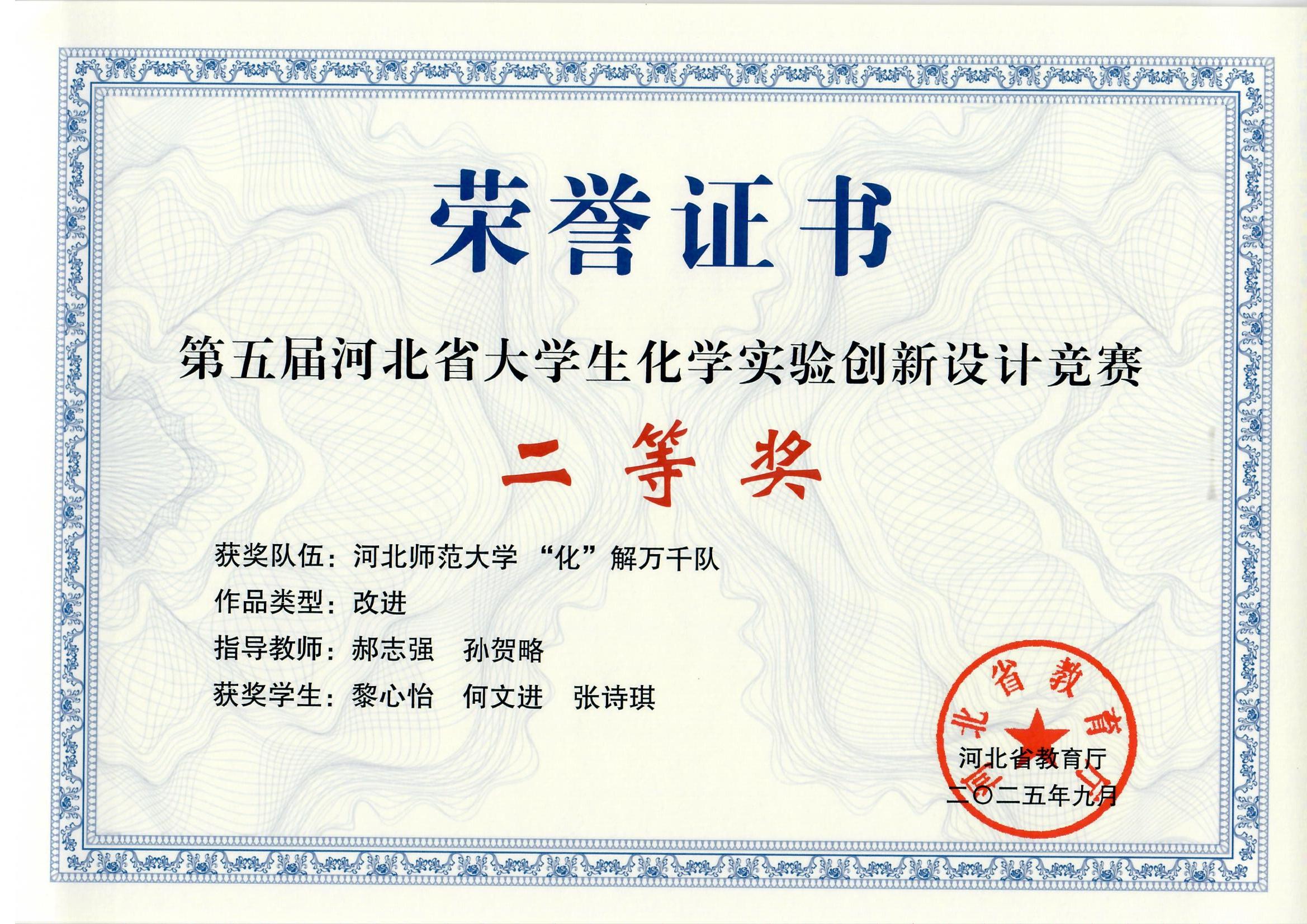 2025年6月20日-22日,第五届河北省大学生化学实验创新设计竞赛在河北工业大学举行。我校800cc全讯白菜网主站参赛的三支队伍再获佳绩,张天诚、张雅琪和蒋斯赢学生团队,沈静伊、张笑和马伊灿学生团队荣获大赛一等奖,黎心怡、何文进和张诗琪学生团队荣获大赛二等奖。